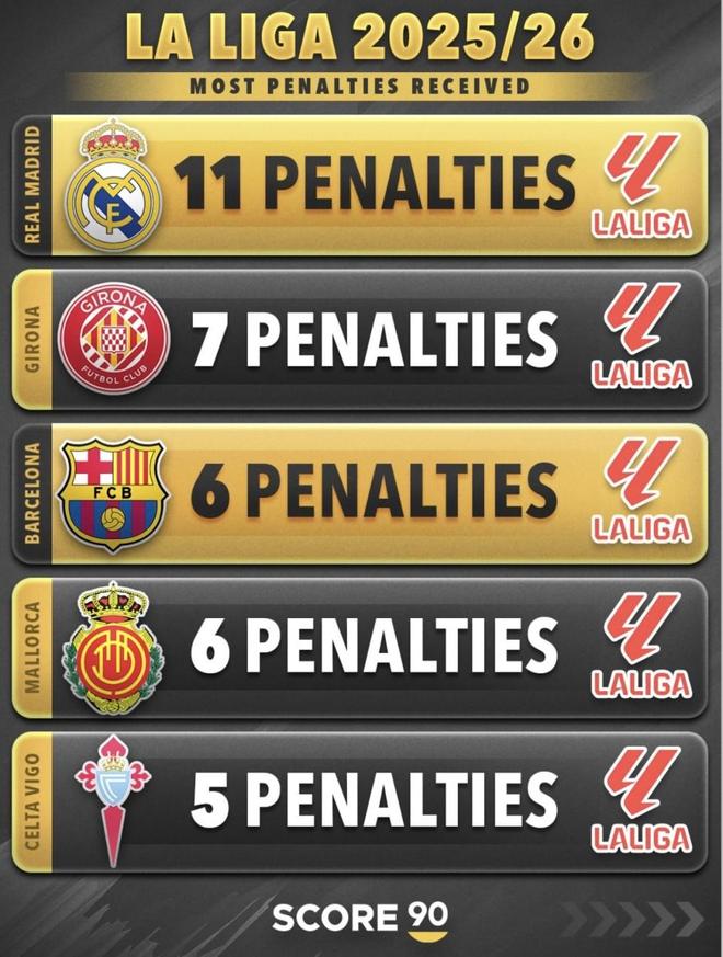 2025/26:皇家马德里11、赫罗纳7、巴塞罗那6、马略卡6、塞尔塔5
