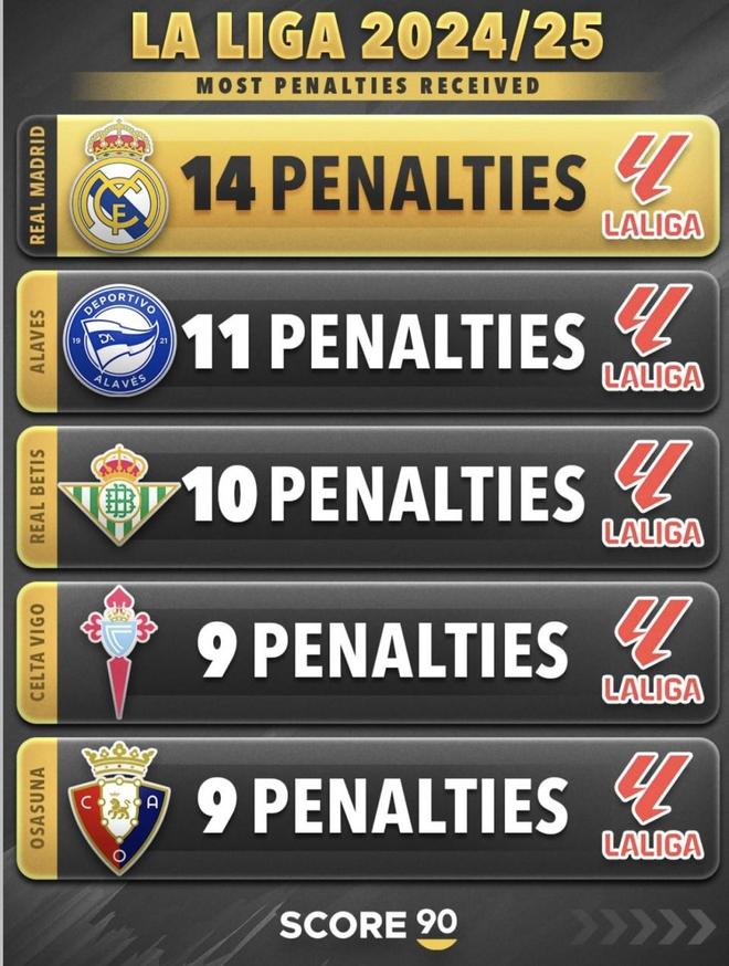 2024/25:皇家马德里14、阿拉维斯11、皇家贝蒂斯10、塞尔塔9、奥萨苏纳9