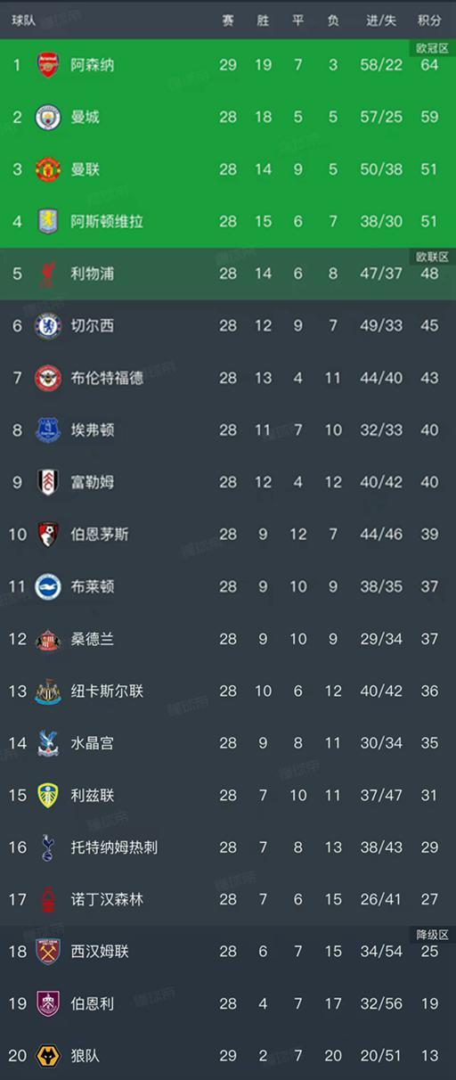 英超最新积分榜