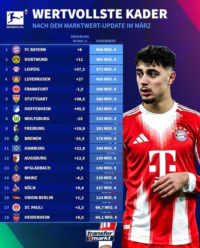 北京时间3月21日,在更新了德甲球员的身价之后,德转还列出了此次更新后德甲俱乐部的身价排行榜,拜仁慕尼黑9.66亿欧元断档第一,多特蒙德、RB莱比锡以及勒沃库森分列第二至第四位。