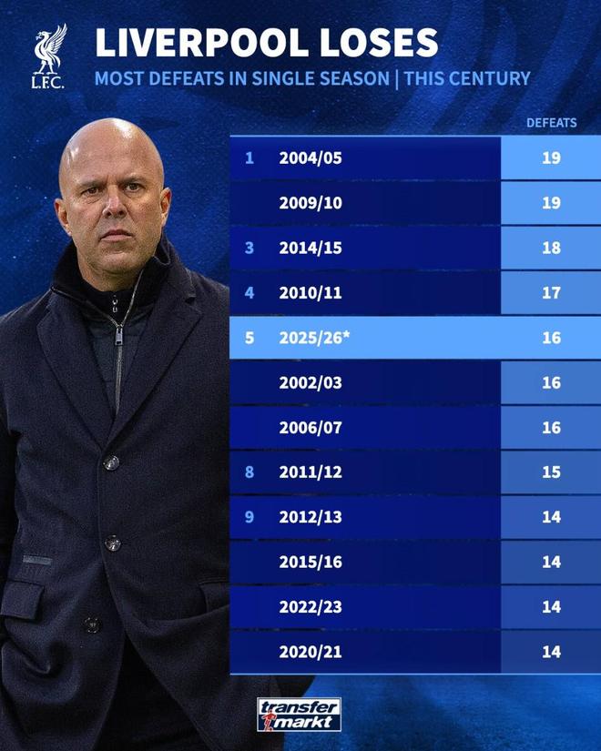 利物浦本赛季各项赛事已经输16场,为本世纪第五多