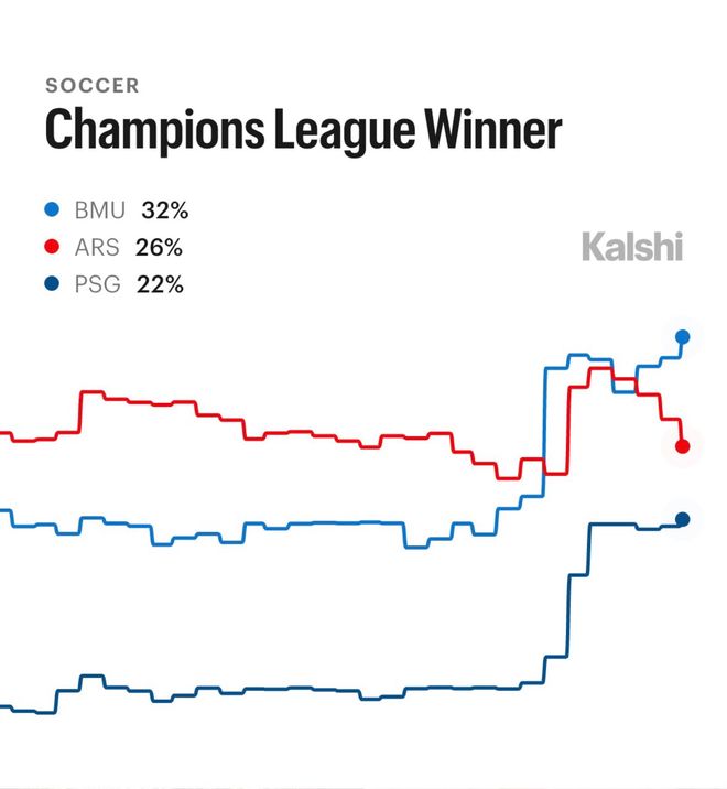 32%的夺冠概率,拜仁慕尼黑在Kalshi预测市场上反超阿森纳。更离谱的是,皇家马德里6%垫底——这支14冠球队比巴萨还低1个点。
